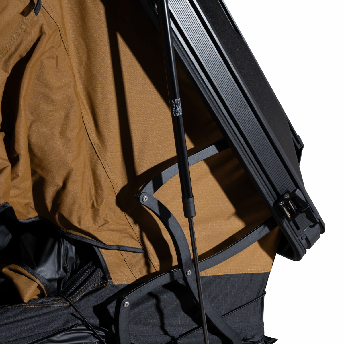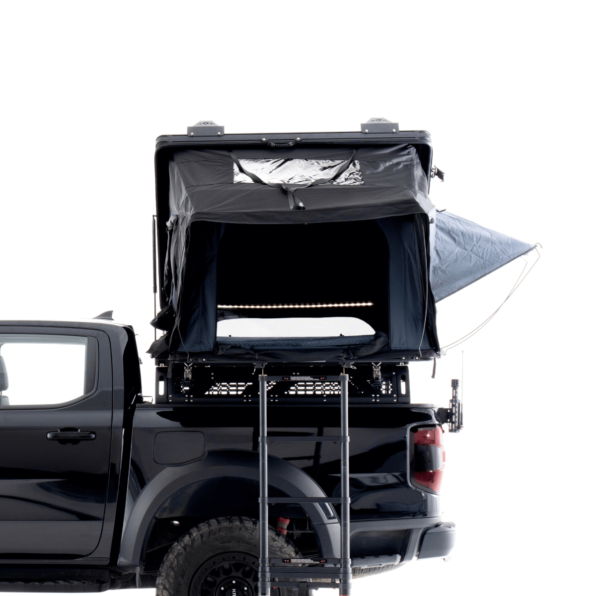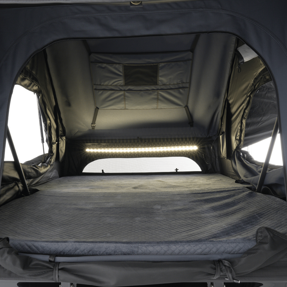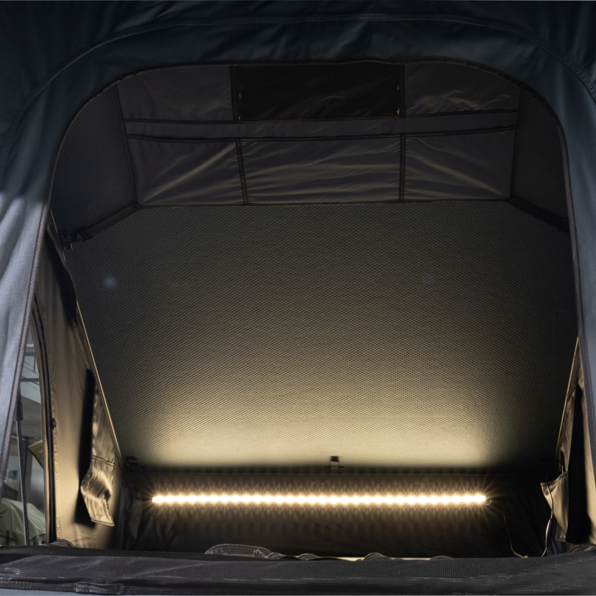 La Cervina 145 s’ouvre comme une tente de toit rigide classique de type “triangle”, avec une mise en place rapide et intuitive. Mais elle va plus loin : sa paroi arrière peut s’ouvrir pour offrir un espace supplémentaire, idéal pour dégager la zone des pieds ou de la tête. Ce système ingénieux améliore le confort intérieur sans compromettre la solidité ou la simplicité d’installation.