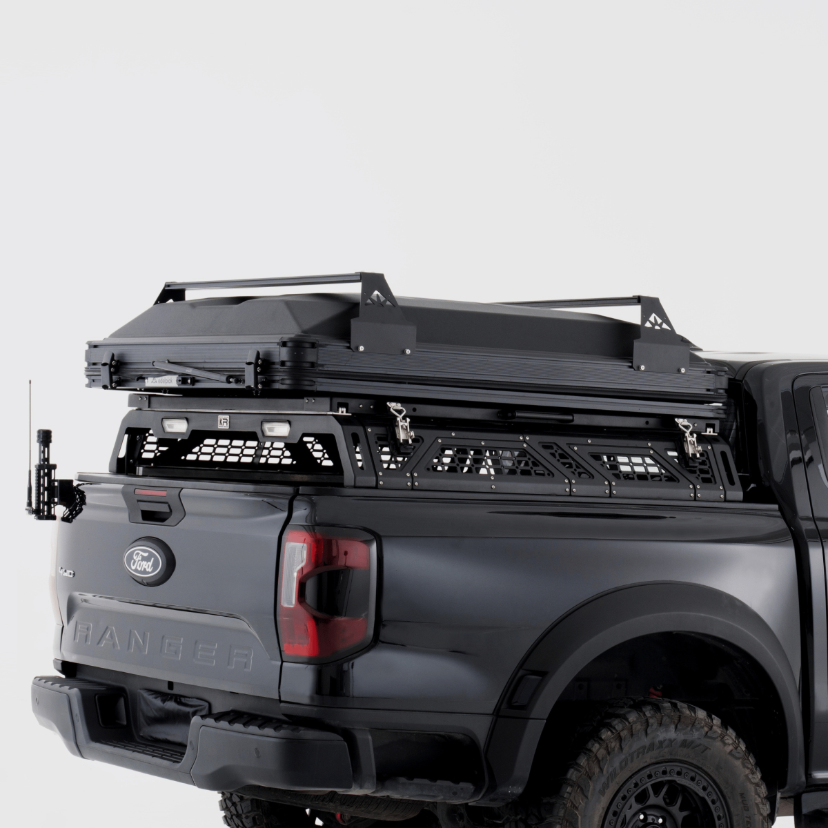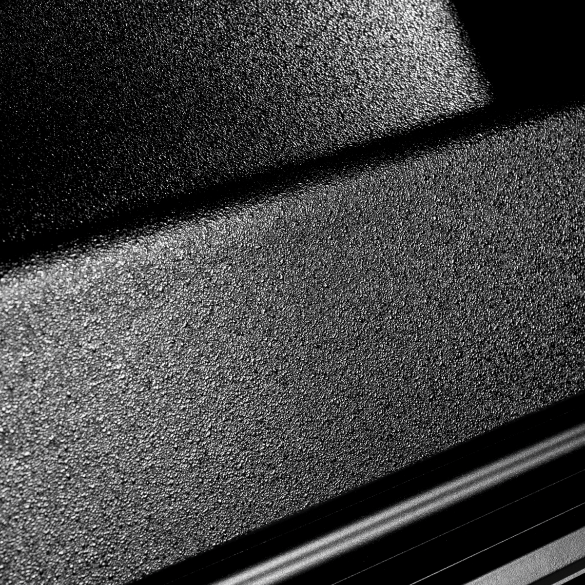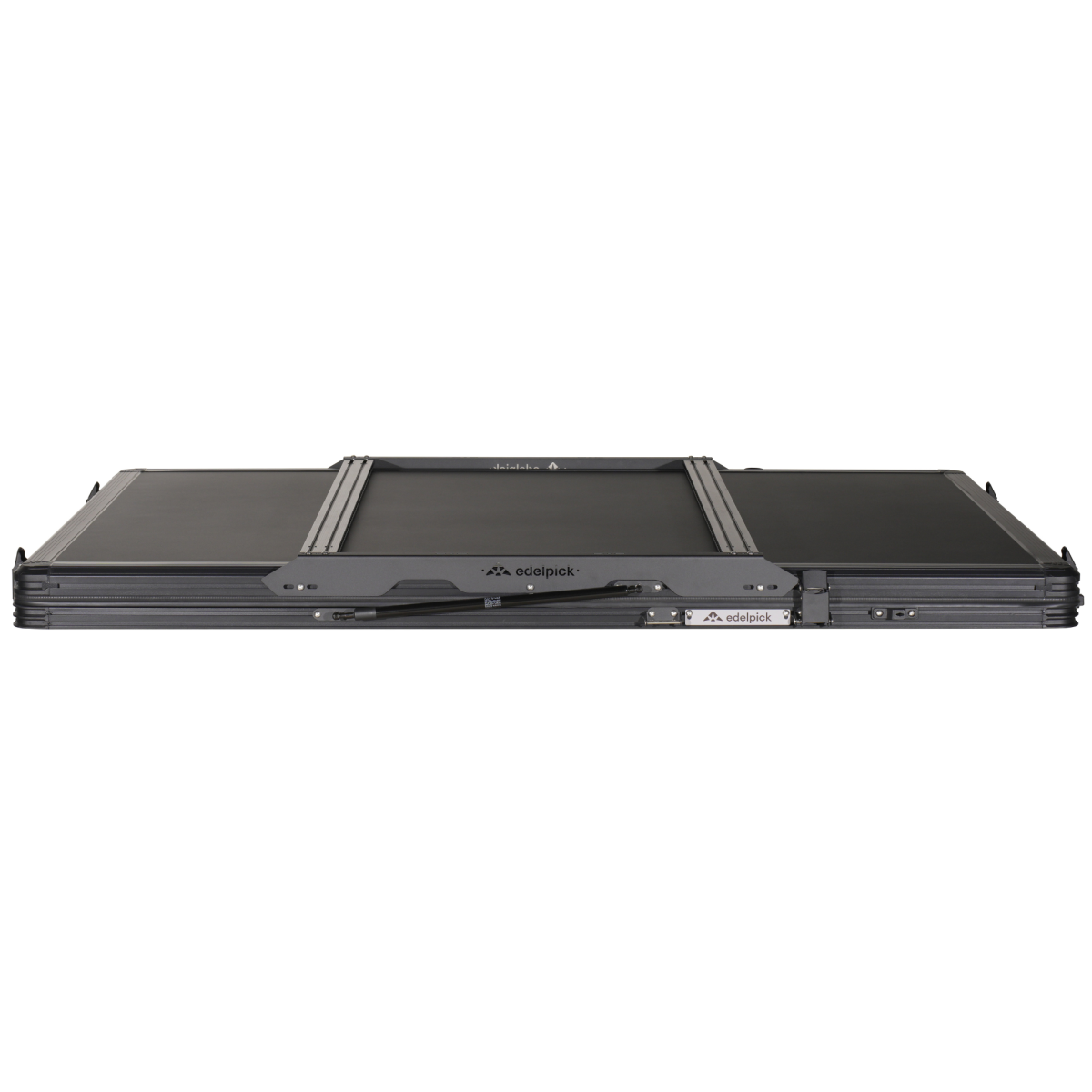 - Le plateau inférieur est constitué de panneaux en aluminium alvéolaire, renforcés par un exosquelette en aluminium et des ferrures en acier inoxydable. La coque supérieure intègre un insert en ABS de haute qualité, traité avec un revêtement Line-X pour une robustesse accrue, parfaitement encastré dans un cadre en aluminium.