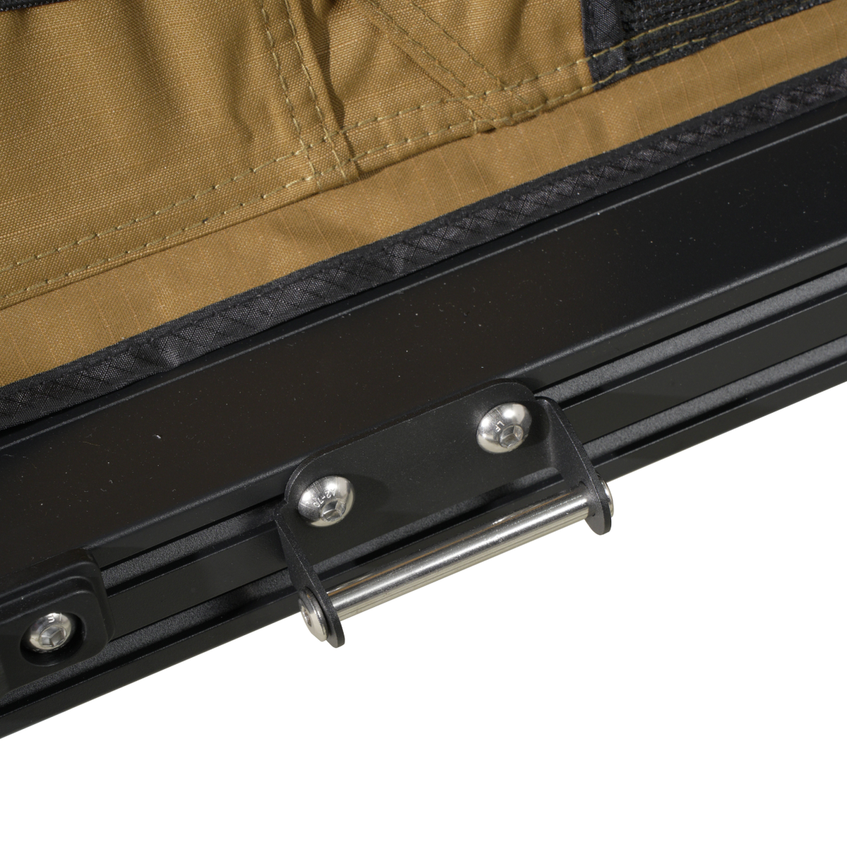 - Base de la tente : Tube en aluminium soudé avec une plaque d’aluminium noire diamantée plus épaisse à l’extérieur, profil de base de tente noir et protection des coins.